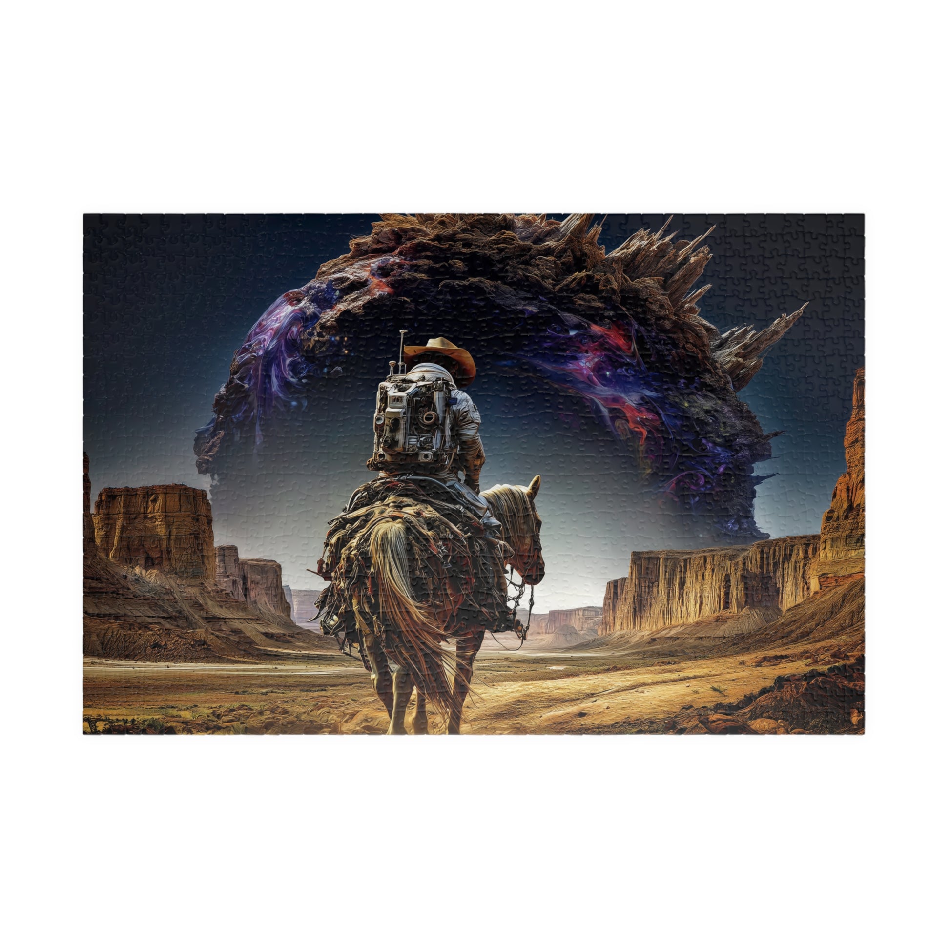 A lone rider journeys through a canyon of ochre stone, his silhouette cutting a sharp figure against the shimmering veil of the unknown. Clad in the hybrid garb of astronaut and cowboy, he carries both the grit of the frontier and the wonder of exploration. The desert floor stretches endlessly beneath him, its golden dust rising like a ghostly echo of worlds long gone. Above, an impossible formation dominates the heavens—a colossal rift twisting with cosmic fire, where galaxies seem to spill into the sky like ink in water.